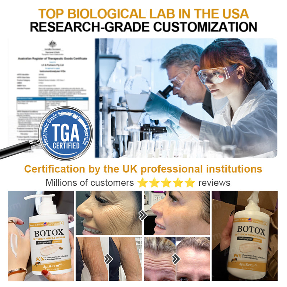 La Crema Multiusos Reafirmante de Arrugas ApisDerm™ Botox BeeVenom combina péptidos de veneno de abeja y tecnología similar a la toxina botulínica para penetrar profundamente en la piel, estimulando la producción de colágeno. Mejora la firmeza y elasticidad del rostro , cuello , brazos , abdomen , muslos y glúteos , mejorando la flacidez y la piel flácida. El ácido hialurónico proporciona una hidratación profunda, suavizando las líneas de expresión y dejando la piel tersa y joven . Con el uso regular, esta crema ayuda a restaurar una apariencia más esculpida y tersa en rostro y cuerpo.
